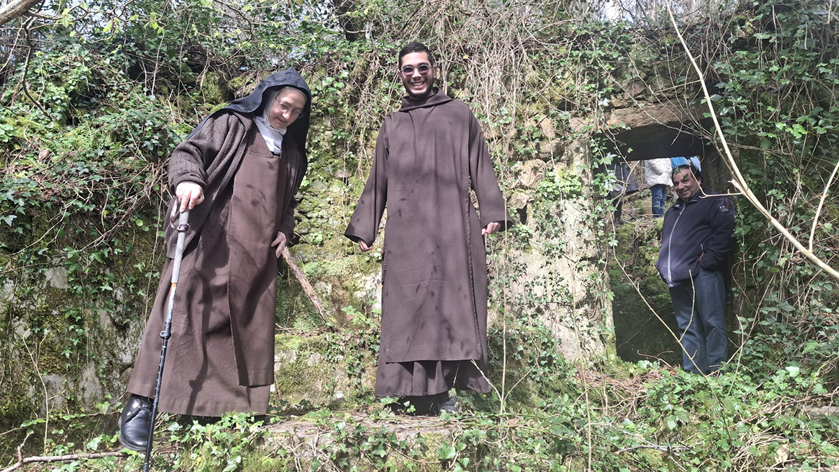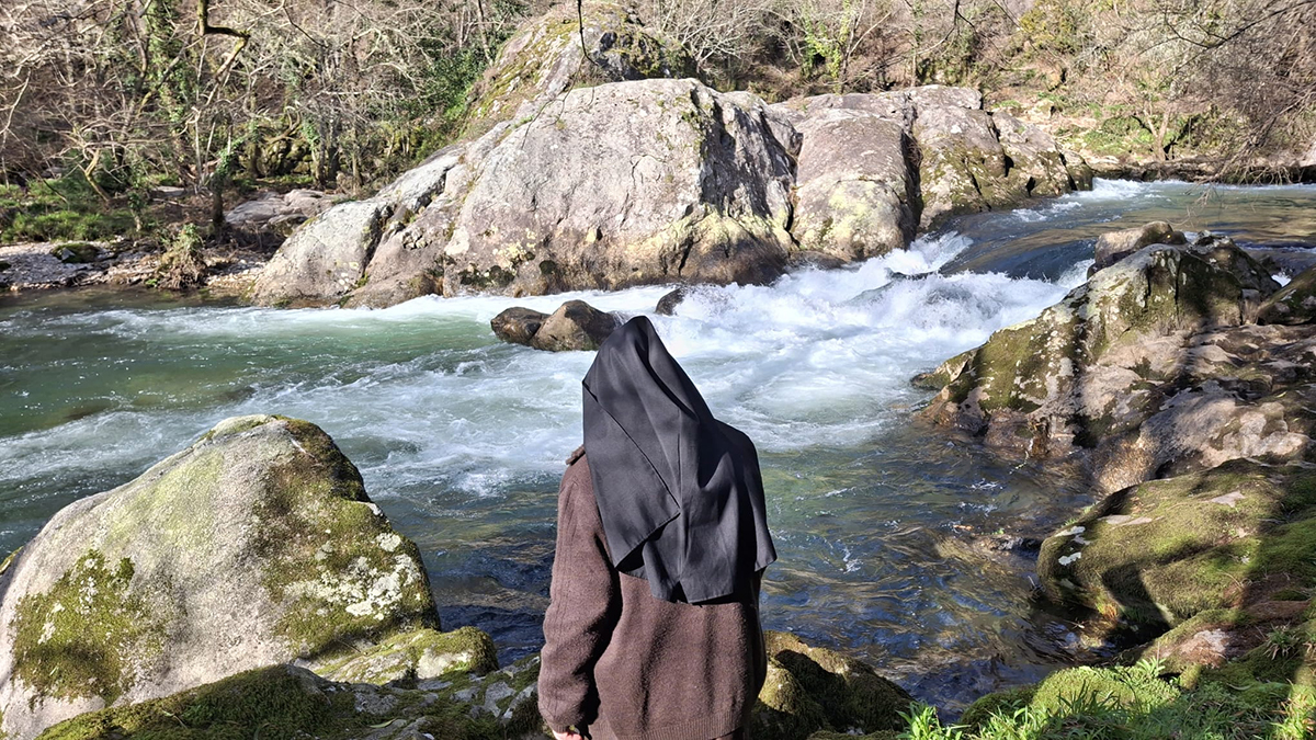 Um grupo de participantes caminhou pelo caminho entre eucaliptos em direção ao rio Umia, mais concretamente ao Penedo, o local onde nasceu a Venerável e onde se conservam vestígios da sua casa e do moinho familiar.